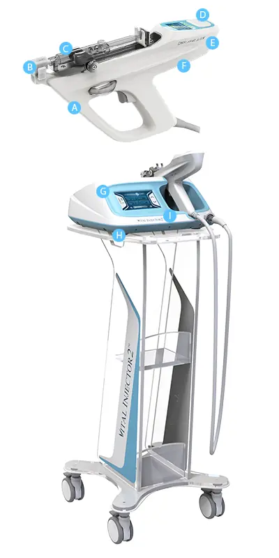 Vital Injector 2, yüz ve vücut iğneli mezoterapi için devrim niteliğinde bir cihazdır. Vital Injector 2 ile mezoterapi ağrısızdır, morarma yapmaz ve iyileşme süreci gerektirmez. Vital Injector, preparatın cilde hassas bir şekilde uygulanmasını sağlar. Cihaz kontrol panelinde cilde enjekte etmek istediğiniz preparatın derinliği ve miktarı ayarlanabilmektedir. Enjeksiyon aynı anda birkaç yerde, tam olarak aynı dozda ve tam olarak aynı derinlikte uygulanır. 15 dakika içinde 1.000 - 2.000 enjeksiyon işlemi yapılabilmektedir. Bu, geleneksel manuel mezoterapi ile mümkün değildir. Cihaz, epidermisi damarlardan ve sinirlerden uzaklaştıran vakum-vakum sistemi de dahil olmak üzere yenilikçi çözümler kullanır, bu sayede işlem ağrısız olmasının yanı sıra kan damarlarına zarar verme riskini de minimize etmektedir. Bu nedenle işlem sonrasında morluklar oluşmaz.