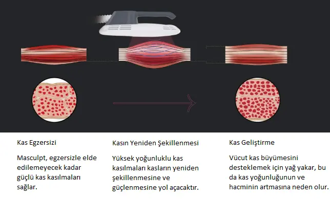 Genel egzersiz yaparken beyin kas motor nöronlarını kontrol eder. Kas kasılmasının yoğunluğu ve genliği sınırlıdır. Kas liflerinin yalnızca %20-30'u aktif olacaktır. Kısa sürede kas gelişimini sağlamak zordur. EMS, kas liflerinin neredeyse %100'ünü aktif hale getirir. Bu güçlü kas kasılması sonuçta kas kütlesi oluşturur ve sonuçta daha güçlü, daha belirgin kaslar elde edilir, kas kalınlığını ve yoğunluğunu arttırır, kasları hızla güçlendirir. Yani kas yoğunluğunu ve hacmini arttırmak amacıyla, miyofibrillerin büyümesi (kas genişlemesi), yeni protein zincirleri ve kas liflerinin üretimi (kas hiperplazisi) sağlanmaktadır. HIFEM teknolojisinin %100 limitli kas kasılması büyük miktarda lipolizi tetikler. Yağ asitleri trigliseritlerden parçalanarak yağ hücrelerinde birikir. Yağ asitleri çok yüksektir, bu da yağ hücrelerinin apoptoza uğramasına ve birkaç hafta içinde normal metabolizma yoluyla vücuttan atılmasını sağlar.